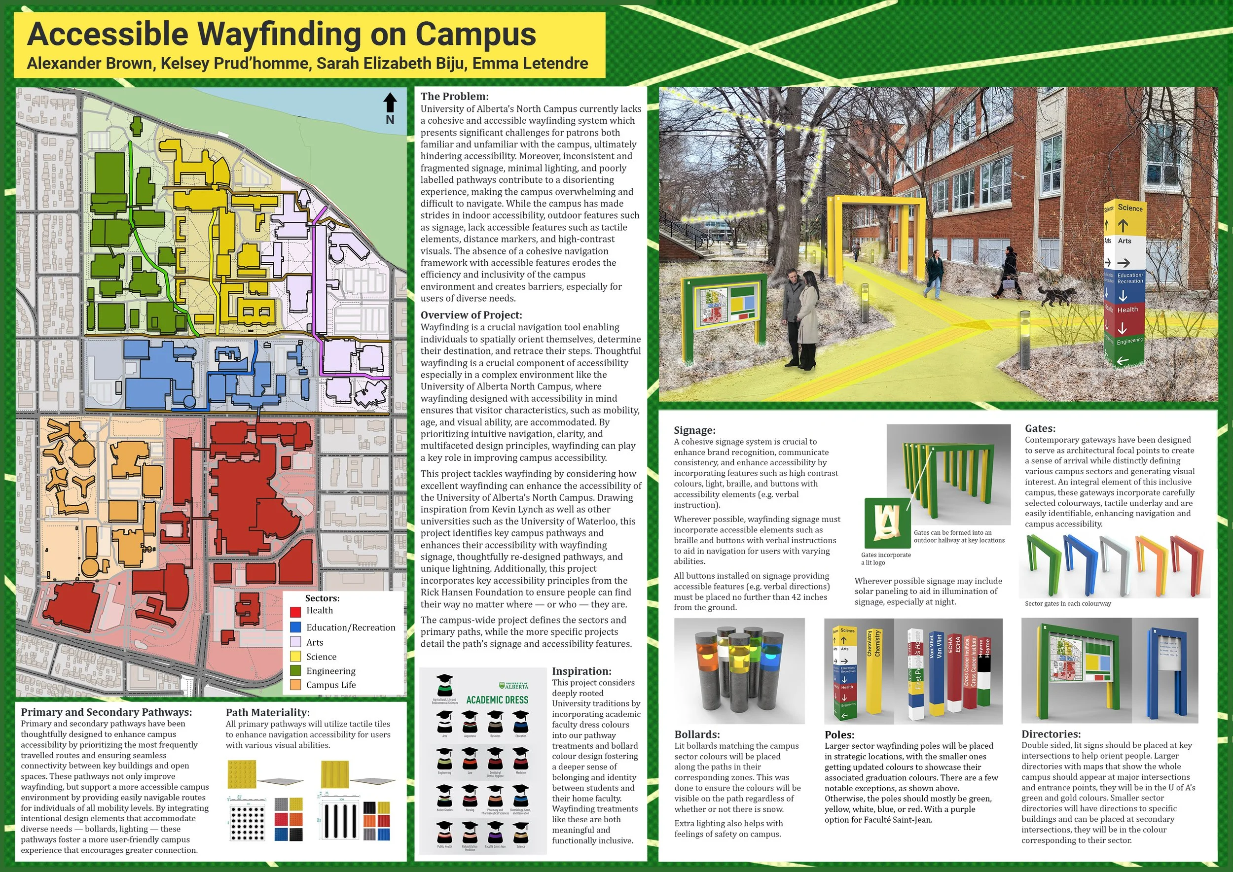 We wanted to help people be better able to orient themselves when they're on campus, so we broke it into colour-coded sectors that correspond with the general graduation colours of each respective area. Then, because for most of the year this is a winter campus, we proposed adding in signage, lighting, and maps that would sit above the snow and help people get where they're going no matter the weather.